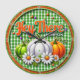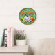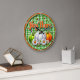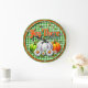 Este relógio festivo apresenta um fundo de gingham verde e branco vibrante. A face do relógio é decorada com três abóboras em verde, branco e laranja, cercadas por margaridas brancas e pequenas joias coloridas. O topo da face do relógio tem "Ei Lá" em letras laranja e "PUMPKIN" em letras brancas menores, com todo o design dentro de uma borda verde brilhante. As mãos do relógio são pretas, e os números estão estilizados em uma fonte festiva