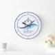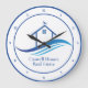 Este relógio moderno do escritório da imobiliária é feito sob o nome do agente em tipografia azul com o seu negócio real. A design de onda azul artística por baixo de uma casa com uma faixa do tempo por cima combina o contemporâneo com o clássico de um logotipo de corretor que apelará a muitos clientes diferentes de compras em casa.