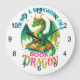 Design vibrante e colorido com uma pilha de livros, um rosa e um dragão. O texto colorido diz: "Eu não sou um rato de biblioteca. Eu sou um dragão de livros". Esse design está disponível em uma grande variedade de produtos.