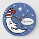 Uma ilustração da lua em seu boné noturno cercado por estrelas em um céu noturno claro.