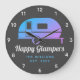 Um relógio de parede alegre, perfeito para o seu campista ou RV. Mostrado com um fundo de carvão e design de camper roxo e azul opre com a frase "Campers Felizes". Personalize seu nome de família para torná-lo de um tipo. A cor de fundo também pode ser alterada para corresponder à decoração e preferências.