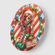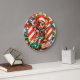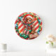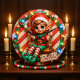 Este relógio festivo apresenta um elfo alegre com bochechas rosadas e orelhas pontiagudas, vestindo uma roupa vermelha e branca listrada, e um chapéu de Papai Noel. O elfo está sentado sobre uma oscilação de madeira, suspensa em frente a um fundo listrado de cana-doce vermelha e branca. A cena é adorada com luzes de Natal, Holly, e um pequeno letreiro que diz "NATAL MERRY". As mãos do relógio são pretas, e os números estão estilizados em uma fonte festiva, todos enquadrados dentro de uma borda circular.