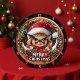 Esta ilustração encantadora mostra uma criança doce de face com olhos azuis brilhantes, vestindo um chapéu de Papai Noel e uma casaco xadrez. Ela está espiando por trás de uma coroa de Natal nevada decorada com pinecones e amoras sagradas. Um cartaz na parte inferior diz 'MERRY CHRISTMAS', criando um design alegre e festivo de férias.