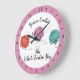 Caracteres de fios super bonitos segurando ganchos de crochê neste relógio de parede para os ofícios de crochê obsessivos, personalizados com o texto acima e abaixo mais a cor de fundo.