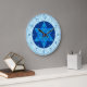 A pintura digital original bonita decora a cara deste pulso de disparo de parede. Contra um fundo subtil do aqua & de flocos de neve azuis é uma estrela de David altamente estilizado do azul & do aqua que senta-se dentro de um medalhão redondo dos azuis marinhos. Os numerais da cerceta para horas & minutos fazem este pulso de disparo fácil de ler.