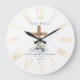 Este elegante relógio floral personalizado apresenta uma imagem de aquarela religiosa no centro. Uma cruz de madeira é acentuada com flores brancas e azuis, e delicada verde. Por cima da cruz de madeira, é impressa uma amostra de verso de bíblia para o nascimento de um bebê, com uma amostra de nome impresso a seguir. Você pode personalizar o relógio para incluir seu próprio nome personalizado ou texto. As horas são impressas em um padrão numérico ouro romano.