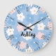Flores brancas, azuis e cor-de-rosa com estilo retrorreflector branco, azul e rosa sobre fundo azul claro com rosto de relógio numérico romano e texto personalizável