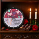 This circular wall clock features a split-design theme celebrating love. The top half is a vibrant, dimensional pattern of floating hearts in various shades of red, pink, purple, and mint green, some pierced by arrows. The bottom half is a soft lavender-purple color and contains the text "Forever Yours" in elegant black script. The word "LOVE" is rendered prominently in large, rose gold letters. Small purple doves and a diamond icon accent the text. The outer border of the clock face is solid black