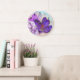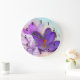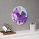 Um relógio com uma fotografia adorável de um roxo escuro, um pote de dentro de vidro. Uma flor roxa leve está presente no fundo.