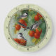Aves no pomar de maçã durante a colheita do outono. Dois filhotes de pele preta num macieiro, enquanto um terceiro miúdo se senta num cesto cheio de fruta madura e recentemente colhida pronta para comercialização. Tudo num fundo verde alegre e padronizado. Trabalho de arte realista criada de uma pintura original de petróleo pelo artista da vida selvagem Crista S. Forest.