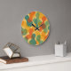 This contemporary clock design showcases a vibrant pattern of abstract geometric shapes, complemented by a striking color palette that includes teal, blue, green, orange, and yellow. Its ornate and eclectic style appeals to artistic fashionistas, trendsetters, and enthusiasts of vintage retro art, as well as those who appreciate abstract digital designs.