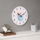 Um relógio com uma imagem fofa de uma garrafa de bebê azul-claro com uma jante rosa.