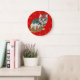 Este gatinho lindo de mesa de Natal está vestindo um arco vermelho muito bonito com um natal Holly na sua cabeça e ela está muito satisfeita consigo mesma enquanto lambe o creme de pudim de Natal das suas patas com sua pequena língua rosa. Seus olhos de gatinha mostram o quanto ela está gostando do seu especial brinde de natal. A bela imagem de gatinho neste relógio redondo de excelente realmente se destaca contra um fundo vermelho festivo, e os números dourados são ousados e fáceis de ver. Penso que este relógio original de natal redondo faz um presente único para qualquer um, amigos, família, colegas e todos os amantes de gatos vão querer ser donos do seu próprio relógio de natal especial durante o feriado. Ou talvez você só queira se tratar com um relógio de natal fofo