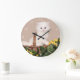 Um gatinho persa branco em uma cesta mais vadia com flores ao redor do que vigiando seu relógio de parede de amantes de gatos. O fundo é bege, os números podem ser removidos