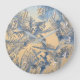 Apresenta geada de cristal de gelo em uma janela com um toque de luz laranja amarela brilhando. Em cores de azul, cinza, branco e amarelo alaranjado. Padrão natural de geada muito bonito.