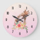 Um relógio com um desenho bonito em aquarelas de uma mãe e uma girafa bebê. A girafa-mãe está descansando a cabeça em cima da girafa do bebê, adorável e adorável. buquê Bonito rosa, amarelo, verde, de flor de aquarela colocado embaixo desse par de queridos. Um plano de fundo de gradiente criado usando uma mistura de cor rosa suave em cor laranja claro.