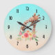 Um relógio com um desenho bonito em aquarelas de uma mãe e uma girafa bebê. A girafa-mãe está descansando a cabeça em cima da girafa do bebê, adorável e adorável. buquê Bonito rosa, amarelo, verde, de flor de aquarela colocado embaixo desse par de queridos. Um plano de fundo gradiente criado com uma delicada mistura de cor azul turquesa numa cor castanha arenosa.