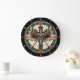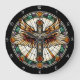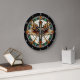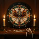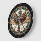 This magnificent wall clock showcases a detailed stained glass design of a majestic cross with beautifully outstretched wings, rendered in a spectrum of warm golden, orange, and subtle green hues. The intricate patterns and radiant colors create a truly inspiring and serene focal point, perfect for adding spiritual elegance to any home or sacred space. Edit color of the clocks numbers in the Design tool to your favored colors.