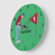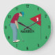 Golfista verde personalizado, vestindo um boné, camisa vermelha profunda e calças azuis, colocando um relógio de design de bola de golfe. Personalize o texto.