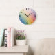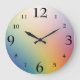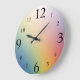 Este na moda e relógio colorido de parede apresenta um design de gradiente do arco-íris. As cores aparecem no mesmo padrão de um arco-íris típico com azul ou índio, verde, amarelo, laranja, vermelho e roxo. As cores aparecem mais densas perto do fundo e gradualmente desvanecem-se em direção ao topo, semelhante a um verdadeiro arco-íris que se desvanece no céu. Os números são impressos em negrito com as letras 12, 3, 6 e 9 impressos ligeiramente maiores.