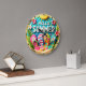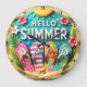 Este relógio circular mostra as palavras "OLÁ VERÃO" em letras lúdicas e dimensionais contra um fundo azul brilhante adornado com raios solares e pequenas estrelas brancas. Abaixo do texto, quatro flip-flops coloridos com vários padrões são exibidos de forma destacada em uma praia arenosa, cercada por folhas verdes e flores cor-de-rosa. O design inteiro está encapotado em um ouro, com uma armação marcada.
