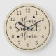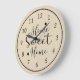 Home Sweet Home em script moderno com uma simples face numérica do relógio sobre fundo brando