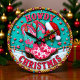 This vibrant, fun clock features a pair of pink and turquoise cowgirl boots decorated with stars and a cow print. Set against a snow-covered ground and a sparkling turquoise background, the design includes a Santa hat and festive greenery. The clock face is encircled by a braided rope border embellished with pink and turquoise jewels, declaring "HOWDY CHRISTMAS" in bold, glittery letters.