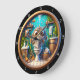 This image is a circular wall clock with a black rim and white numbers, featuring a whimsical illustration of a shocked-looking orange pufferfish wearing snorkeling goggles and reading a newspaper. while sitting on a toilet. The scene is set underwater with blue tiled walls, seaweed, starfish, and a seahorse. Bubbles float around the quirky character, all enclosed within a golden inner frame.