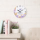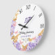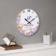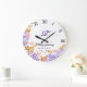Um relógio de festas, moderno, elegante, personalizado, de aniversário de casamento, que inclui uma coroa de borboletas cor-de-rosa e douradas (isto é um efeito digital, não uma folha real), hífenes roxas, tipografia moderna e as palavras "Aniversário de Casamento" em caligrafia elegante, assim como números romanos para a face do relógio. Um belo presente de casamento personalizado ou aniversário de casamento para um jovem - e jovem de coração - casal comemorando suas 1ruas, 3º, 5, 10º, 25 ou 50º aniversário.