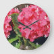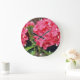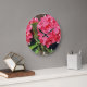 A fotografia original de MaeFlowers neste Relógio de Parede é um close-up de hífenes cor-de-rosa e suas folhas verdes primavera revestidas e irregulares. O pompom central das pétalas de flores quase preenche a foto, cercada pelas folhas verdes e outra pompola de flores do lado. O relógio tem números brancos, mas eles podem ser excluídos se você preferir.