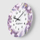 Baseado na minha ilustração de aquarelas de flores roxas. A bela ilustração botânica das flores de verão de cor suave com suas delicadas pétalas roxas, traz alegrias e esperança para a estação de verão. O relógio tem texto no centro que pode ser personalizado para o seu próprio texto.