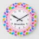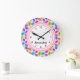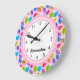 Este relógio colorido de berçário está pronto para o seu nome (opcional). Criado com uma face central branca e rosa com uma borda exterior colorido de folhas. Tão giro para o quarto de bebê ou de menina. Sua escolha de tamanho médio ou grande.