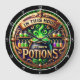 This round wall clock features a magical design of a steaming cauldron brewing green potions, surrounded by shelves of colorful potion bottles. Golden ornate accents frame the scene, with "IN THIS HOUSE" on a banner above and "WE BREW POTIONS" below. It's perfect for anyone who loves magic, witchcraft, or Halloween decor.