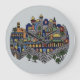 Eu tirei uma fotografia de um prato cerâmico pintado à mão, feito à mão. Estes são itens populares feitos pelos Armênios em Israel. Este prato mostra a Cidade Velha de Jerusalém, Israel, pintada coloridamente e colocada contra um fundo colorido complementar. Você pode personalizar facilmente este produto e escolher uma cor de fundo diferente.