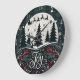 This striking clock features a silhouette of Santa's sleigh and reindeer flying over a forest of dark pine trees, set against a large white moon and a green and blue plaid sky. The bottom half is richly decorated with detailed holly, berries, and pine boughs, centered around the ornate white script word "Joy." The design provides a sophisticated, stylized Christmas look. The design may look real due to the high detail and three-dimensional texture in the artwork.