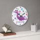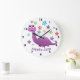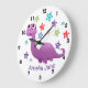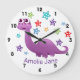 Um design de dinossauro de desenho animado, cercado por estrelas. Adicione o seu próprio nome para personalizar este relógio de dino de viveiro.