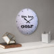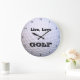 Este relógio de parede "Live, Love, GOLF", preto e branco, redondo, tem um fundo branco com um padrão de bola de golfe nele, com algarismos pretos e texto preto, que você pode mudar para qualquer cor que quiser usando o botão EDIT azul. Se precisar de assistência, envie um e-mail para niteowlstudio@gmail.com.