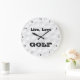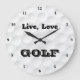 Este relógio de parede "Live, Love, GOLF", preto e branco, redondo, tem um fundo branco com um padrão de bola de golfe nele, com algarismos pretos e texto preto, que você pode mudar para qualquer cor que quiser usando o botão EDIT azul. Se precisar de assistência, envie um e-mail para niteowlstudio@gmail.com.