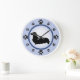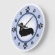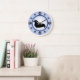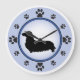 Os donos de Dachshund e amantes de cachorros vão desfrutar dessa divertida design moderna apresentando uma silhueta de dachshund de cabelos longos e pegadas representando os números na face do relógio, com um fundo de anel azul e azul mais escuro.