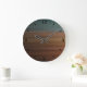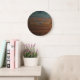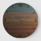 Relógio de parede redonda grande, decoração de arte de parede e acessório de decoração caseiro com imagem de design de trabalho de arte de deserto pintado do sudoeste por TheFabricSeal em Zazzle. Esta bela ilustração gráfica digital apresenta uma falso superfície de madeira com escova de ar e listras horizontais pintadas por aquarelas com lindas cores inspiradas nos desertos do magnífico Sudoeste. Tons de paleta colorida de preto, marrom, burgundy, red, rust, terra cotta, tijolo, tan, areia, azul-turquesa e verde.
