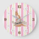 Este adorável relógio de parede apresenta um canguru mama e seu bebê, colocados sobre um fundo de listras cor-de-rosa pastel e amarelas. Há uma fina faixa verde de ênfase e duas flores brancas completam o design. A faixa em Mama Kangaroo pode ser personalizada com o nome do seu filho ou você pode remover a faixa e o nome. Este relógio faz parte da "Coleção de Kangaroo Mamães e Eu".