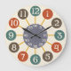 Este design de relógio divertido é inspirado pelos relógios atômicos dos anos 50. Os números de bege estão em círculos de vários tons antigos de laranja, marrom e azul lacrimogêneo. Eles aranha para fora de um centro redondo em uma matiz de cinza que conta os segundos/minutos. É uma design simples, ousada do século médio com um sentimento masculino. Tudo repousa sobre um fundo bege antigo, mas você pode personalizar essa sombra para qualquer um de que você goste para que o relógio corresponda melhor à sua decoração doméstica.