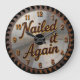 This image displays a round wall clock designed to look like a circular saw blade. The clock face is metallic silver with a distressed, rusty brown texture around the outer edge, mimicking the teeth of a saw blade. The phrase "Nailed it Again" is prominently featured in the center in a bold, dark orange, stylized font with a slight shadow effect. The numbers 1 through 12 are also in a matching dark orange. The clock has dark gray hands and is framed by a thin green outer rim. The overall design suggests a theme of craftsmanship, DIY, or success.