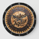 This image features a round wall clock designed to resemble an industrial saw blade, perfect for a workshop or a DIY enthusiast. The clock's outer ring is a distressed, dark, possibly black, band with prominent, sharp saw teeth. Inside this, there's a wider ring in a solid, muted orange or brown color. The very center of the clock face is a smaller, distressed metallic circle with the phrase "Nailed it Again" in a bold, dark script. "Nailed" is in a larger, flowing script, while "it" and "Again" are in a more structured script below. The clock has a black frame with clear white numbers from 1 to 12. Black hour and minute hands point to the time. This piece is ideal for a carpentry workshop, a garage, or as a unique gift for someone who enjoys hands-on projects.