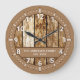 Este relógio rústico pode ser personalizado com seu nome de família e ano estabelecido. Apresenta um fundo de madeira falsa. Esquema de cores / Marrom e branco