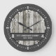Este relógio rústico pode ser personalizado com seu nome de família e ano estabelecido. Apresenta um fundo de madeira falsa. Esquema de cores / Cinzas e branco