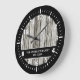 Este relógio rústico pode ser personalizado com seu nome de família e ano estabelecido. Apresenta um fundo de madeira falsa. Esquema de cores / Branco, preto e cinza