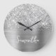 Personalize o script de estilo manuscrito moderno para criar seu próprio relógio redondo. Adicione um monograma inicial atrás do nome para criar sua própria combinação inicial de nome. Glitter prateado sujo de brilho feminino e cinzas de prata metálicas falham em folha de papel digital que impressão como uma foto em seu presente. Há outros relógios de parede brilhantes nesta loja.