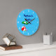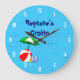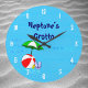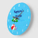 Um relógio personalizado com arte divertida de brinquedos essenciais para a praia ou a piscina uma bola vermelha de praia, guarda-chuva verde, sandálias e óleo de bronzeado em fundo azul com ondas encaracoladas e números brancos opcionais. Clique em Personalizar para alterar fontes, cores e até salvar o design para mais tarde.