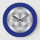 Um relógio de na moda com números de cinzas prateadas em um fundo prateado brilhante com uma borda azul.